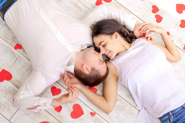 valentine’s day, a couple in love lies among the hearts on the floor hugging